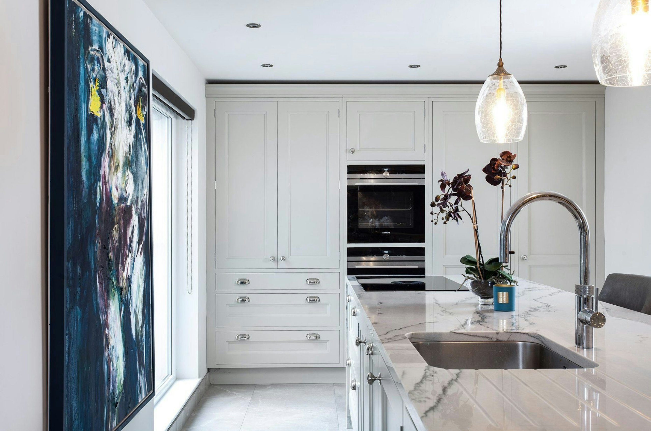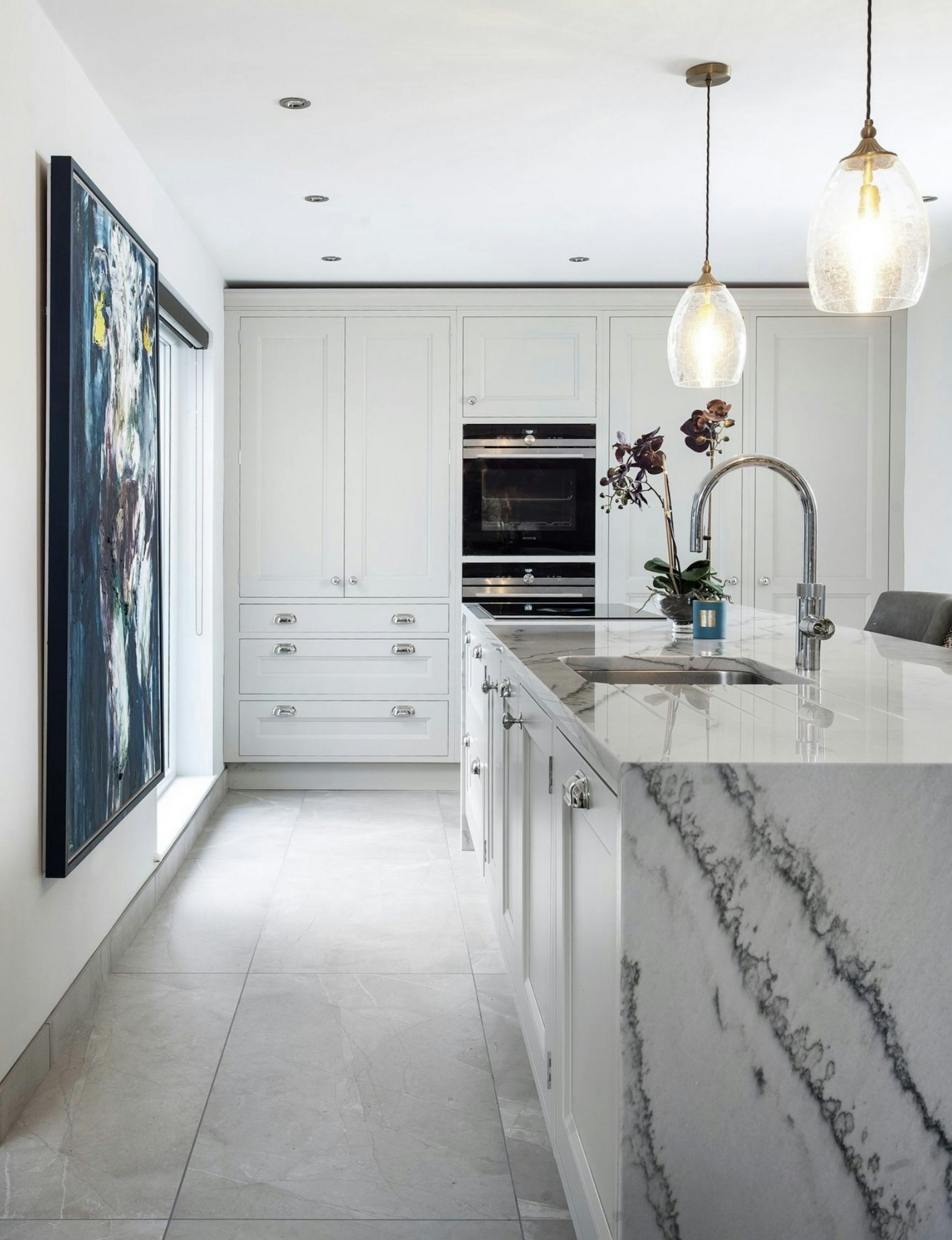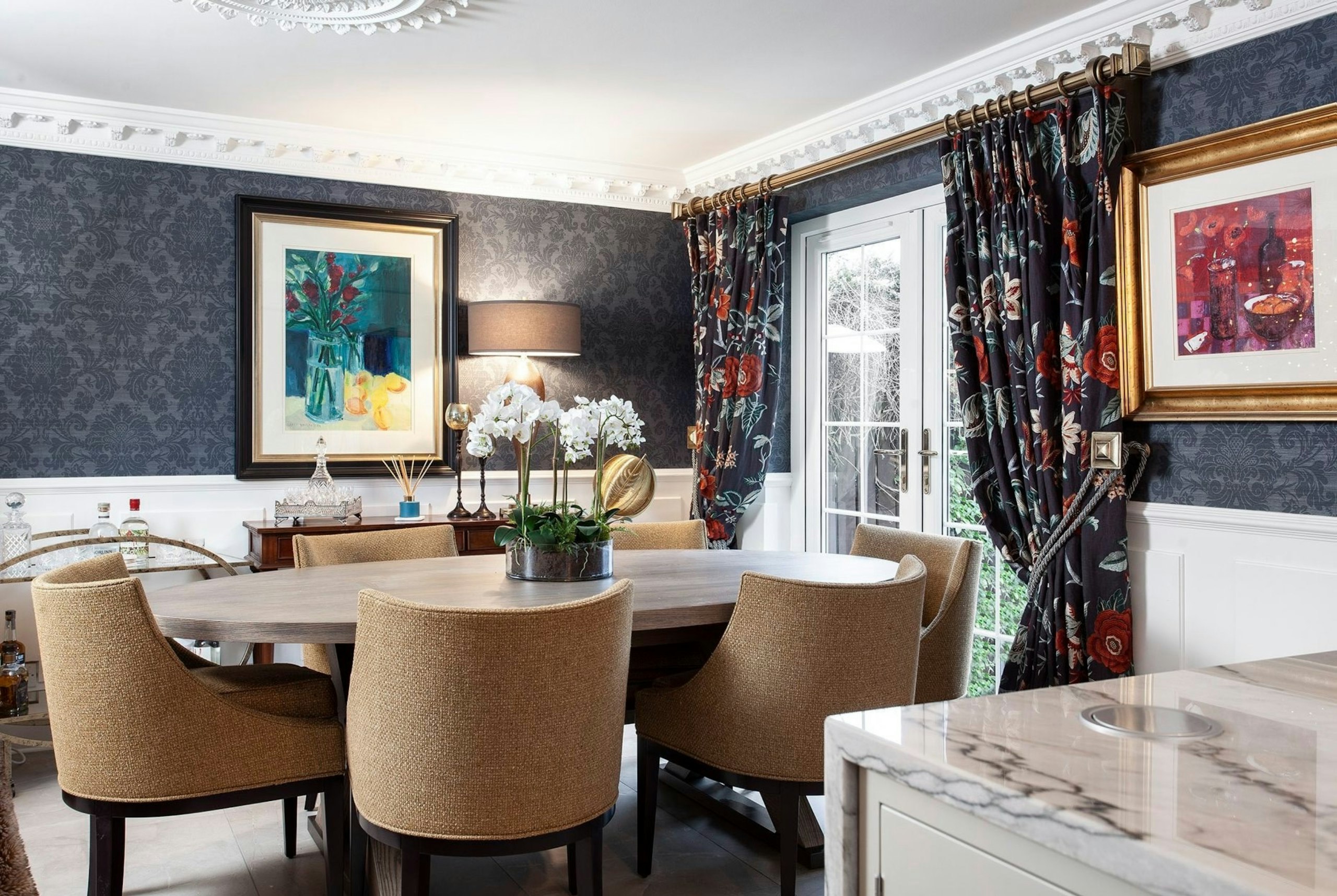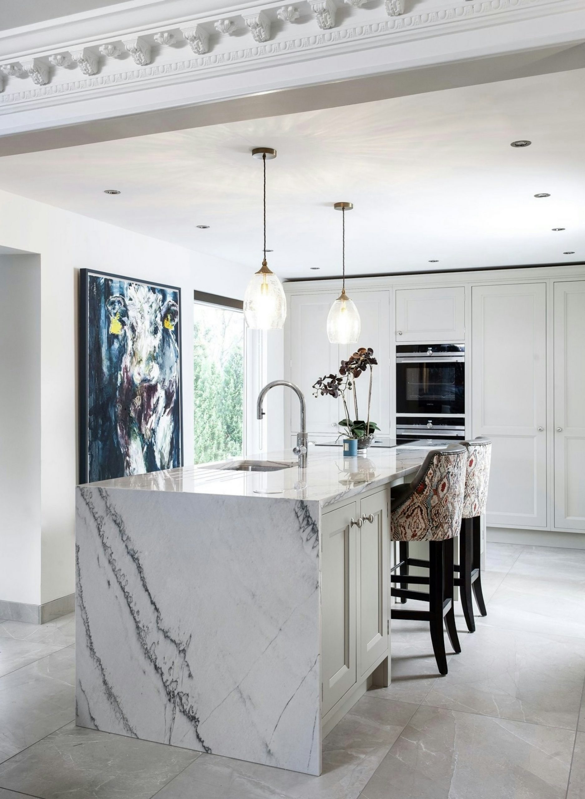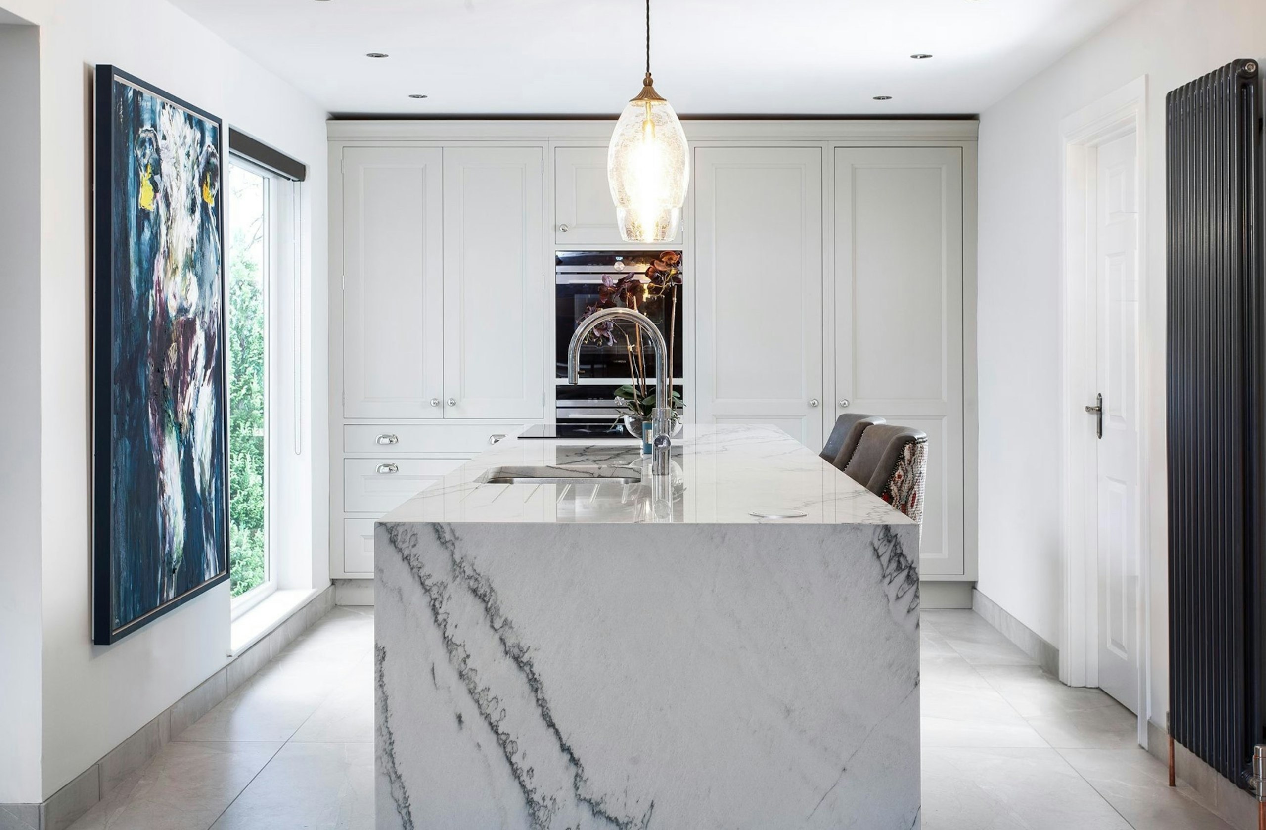 This kitchen dining area exudes timeless elegance with its traditional elements. In the centre of the space, a stunning marble waterfall kitchen island serves as the focal point. Its sleek design and smooth surface add a touch of luxury to the room. Surrounding the island, bespoke furniture complements the overall aesthetic, showcasing intricate detailing and exquisite craftsmanship. The combination of traditional elements and contemporary design come together to create a truly breathtaking kitchen dining area that merges classic charm with modern sophistication.